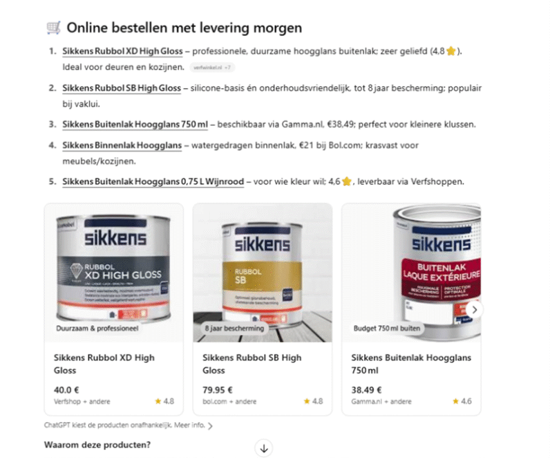 Wanneer krijgt een ChatGPT-gebruiker dit overzicht te zien? Als diegene een prompt invoert waaruit duidelijk blijkt dat hij/zij op zoek is naar een product.